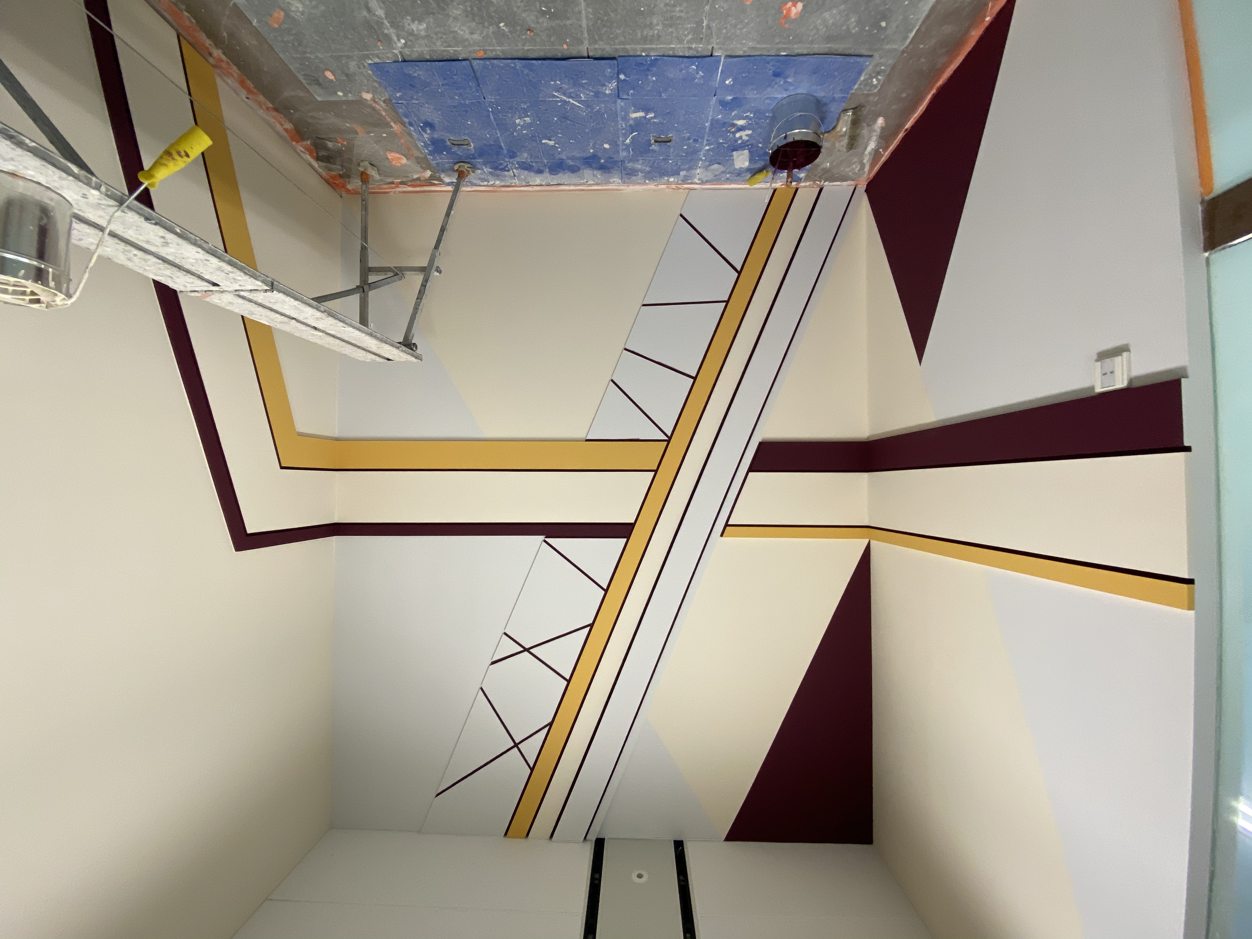 기존벽을 철거하고, 왼쪽 벽면을 1.5m 확장하였어요. 내부 전등 스위치를 옮겨 달아야 했고, 천장 전등 배열도 달라졌어요!